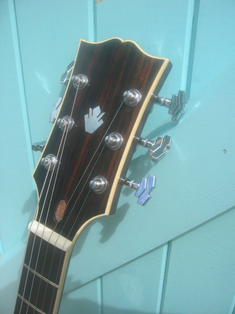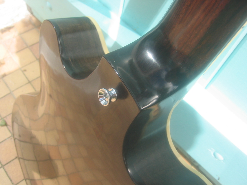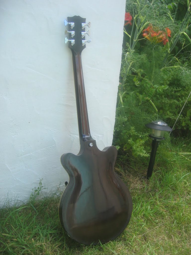 Projet terminé le : ??/08/2008 , 6 cordes hollow , Chevalet : Chevalet type TOM + Bisgby ; Jonction corps / manche : tenon ; Finition : Vernis PU bicomposant V33, teinte brune ; Electronique : 2xP90 format humbucker GFS, 1 tonalité 1 volume ; Essences : manche et touche palissandre indien, table dos et éclisses en noyer américain ; Signes particuliers : table et dos sculptés, éclisses cintrées.