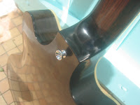 Incrust de la tête avec de la nacre façon Gibson (désolé pour ceux qu'aiment pas mais je lui trouve un truc qui me plait bien...), et perçages des mécaniques: